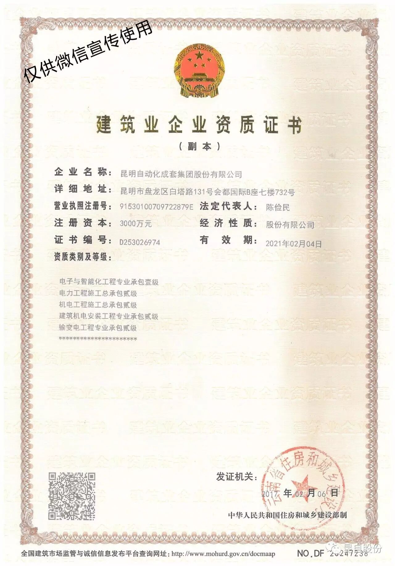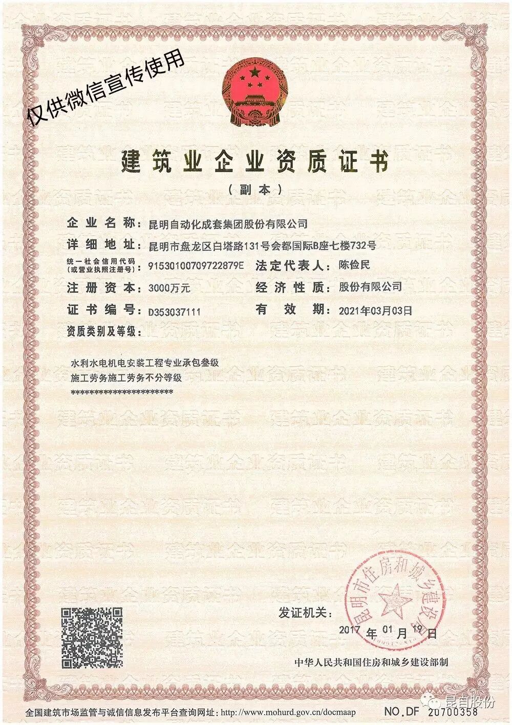 2017年2月10日,云南省住房和城鄉(xiāng)建設(shè)廳公布了關(guān)于核準2017年第六批建筑業(yè)企業(yè)資質(zhì)名單的通告,昆明自動化成套集團股份有限公司的電力工程施工總承包資質(zhì)由叁級榮升貳級,電子與智能化專業(yè)承包資質(zhì)由貳級榮升壹級,并在2017年1月19日已完成了施工勞務(wù)資質(zhì)的增項。資質(zhì)榮升將有力提升公司的品牌影響力和市場競爭力,為開拓市場打下了堅實的基礎(chǔ),同時進一步加快公司晉升綜合資質(zhì)的步伐。