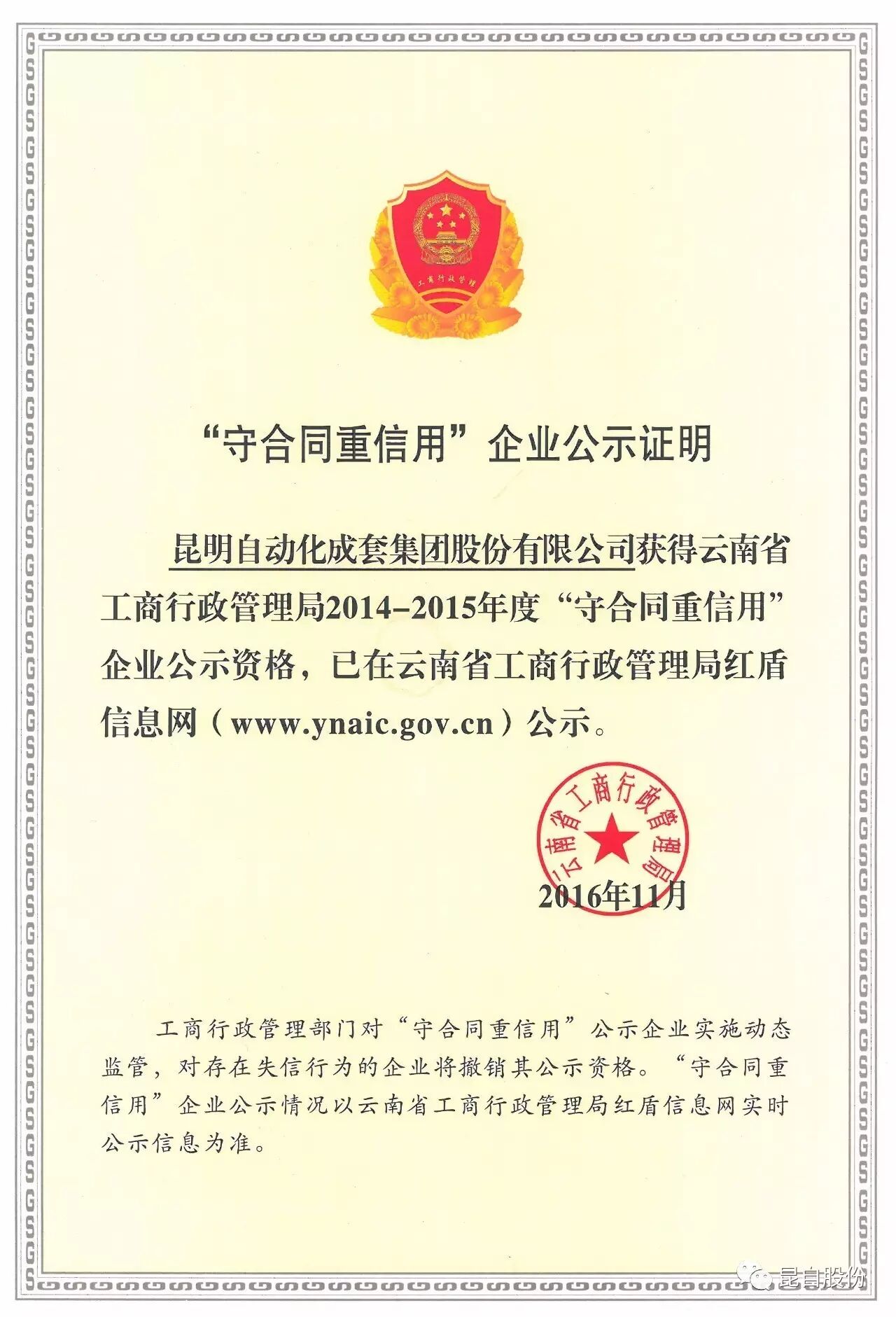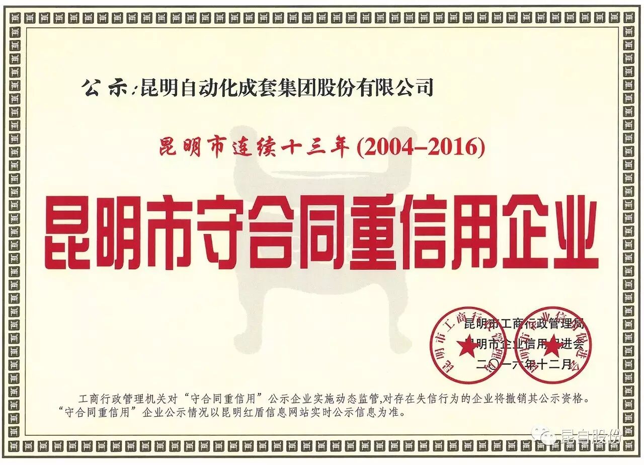 ——記昆自集團(tuán)獲得云南省工商行政管理局、昆明市工商行政管理局和昆明市企業(yè)信用促進(jìn)會(huì)共同頒發(fā)的昆明市連續(xù)十三年(2004-2016)“守合同重信用”企業(yè)榮譽(yù)。